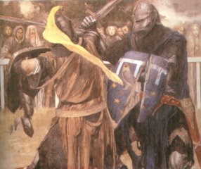 Beide Ritter griffen einander mit Entschlossenheit und Geschick an. Sie kämpften stundenlang. Ihre Schilde waren in Fetzen, und beide Ritter erlitten viele Wunden.