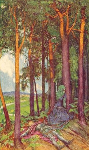 Erec und Enide verließen Guivret und reisten weiter, bis er in den Wald kam, wo König Artus’ Hof auf Jagdausflug war.