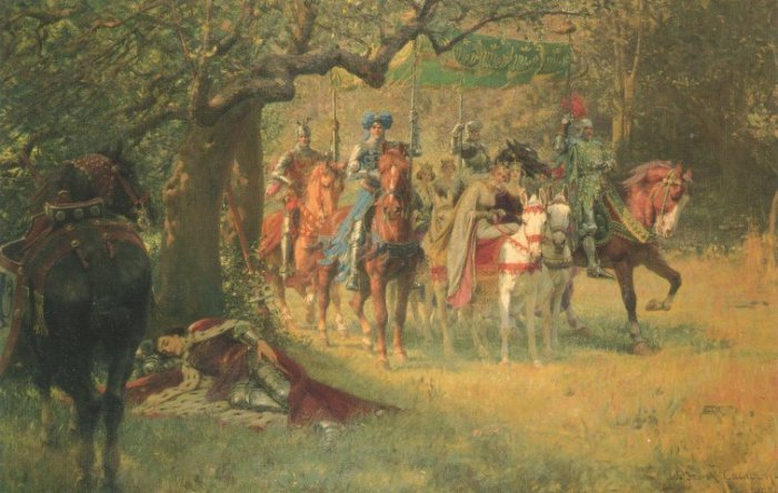 Während Lancelot schlief, sah Lionel zwei Ritter, die mit ihrer Schwester ritten, als ein riesiger schwarzer Ritter auf einem schwarzen Pferd auf sie zukam. Der große Ritter griff an und tötete die Brüder und nahm die Jungfrau.