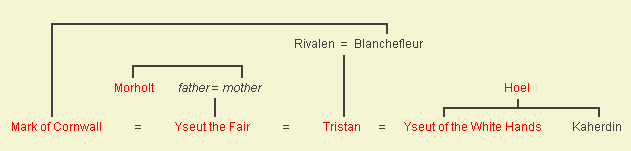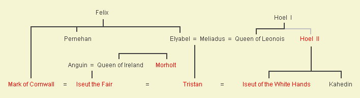 Ich habe vier Fassungen der Tristan-Romanze gelesen, darunter auch die des Deutschen Gottfried von Straßburg aus dem Jahr 1210. Obwohl einige Namen anders geschrieben wurden als in der französischen Version, folgte sie mehr oder weniger der von Thomas verfassten Fassung. Daher habe ich keinen separaten Stammbaum für Gottfried erstellt.