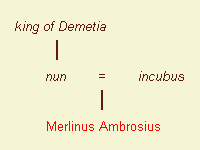 In Nennius’ Bericht hieß der “Knabe ohne Vater” Ambrosius, nicht Merlin. Ambrosius ist tatsächlich der römische Name für Emrys. Nachdem Ambrosius (Merlin) dem König die Ursache für den Einsturz der Mauern erläutert hatte, erklärte er, dass sein Vater ein römischer Konsul gewesen sei — im Gegensatz zu Geoffrey, der behauptete, der Vater des Knaben sei der Teufel oder ein Incubus gewesen.