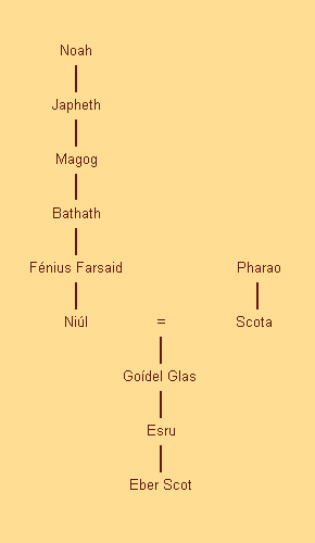Fenius Farsaid war ein Enkel von Magog, dem Sohn Jafets, und lebte zur Zeit des Turmbaus zu Babel, während sein Sohn Niul und sein Enkel Goidel Glas Zeitgenossen Abrahams und Moses waren.