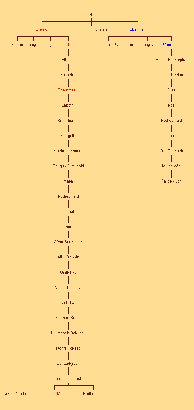 Dieser Stammbaum zeigt eine Liste von Königen, die von Míl aus zwei Hauptlinien abstammten: Eremon und Eber Finn, die jeweils Söhne Míls waren. Die Feindschaft zwischen Eremon und Eber Finn setzte sich über Generationen nach ihrem Tod fort.