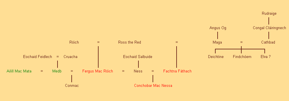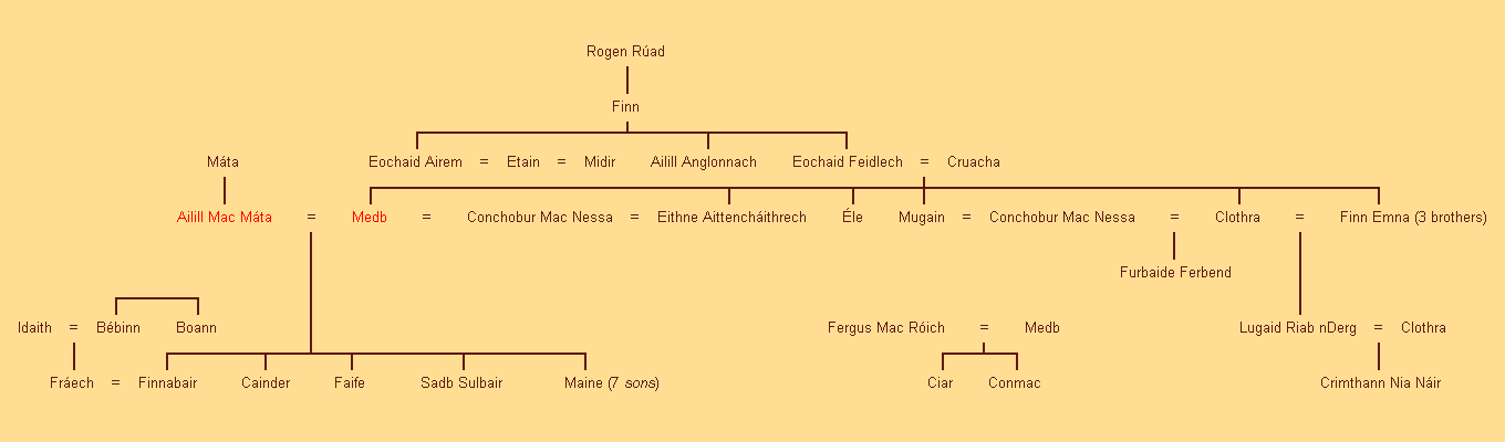 Nachfolgend ist der Stammbaum des Hauses von Connacht der Medb dargestellt. Medb (Maeve) stammte eigentlich aus der Provinz Leinster. Ihr Vater war Eochaid Feidlech, König von Tara. Wie ihre drei Schwestern war sie zeitweise mit Conchobar Mac Nessa, dem König von Ulster, verheiratet. Sie verließ Conchobar und wurde für den Rest ihres Lebens zu seiner größten Feindin.