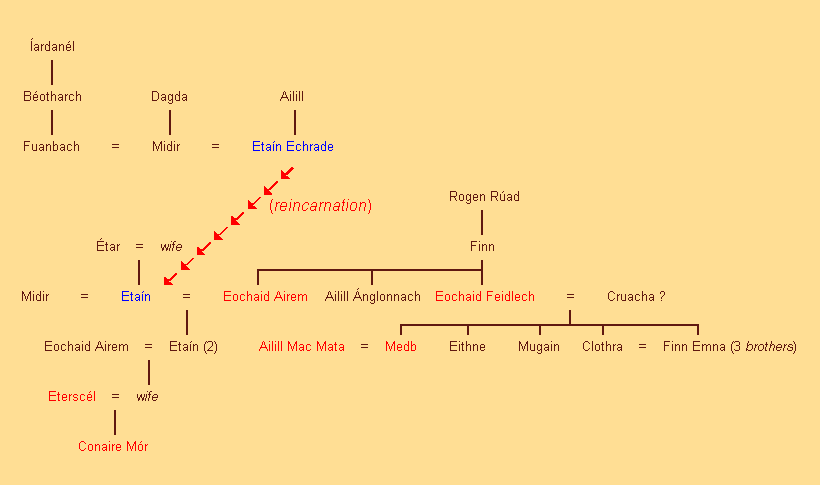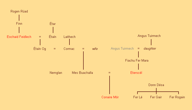 Die obige Genealogie zeigt die Linie von Conaire Mor ausgehend von Étaín; die Quelle hierfür ist Tochmarc Étaín, das “Werben um Étaín”. Siehe Werben um Étaín.