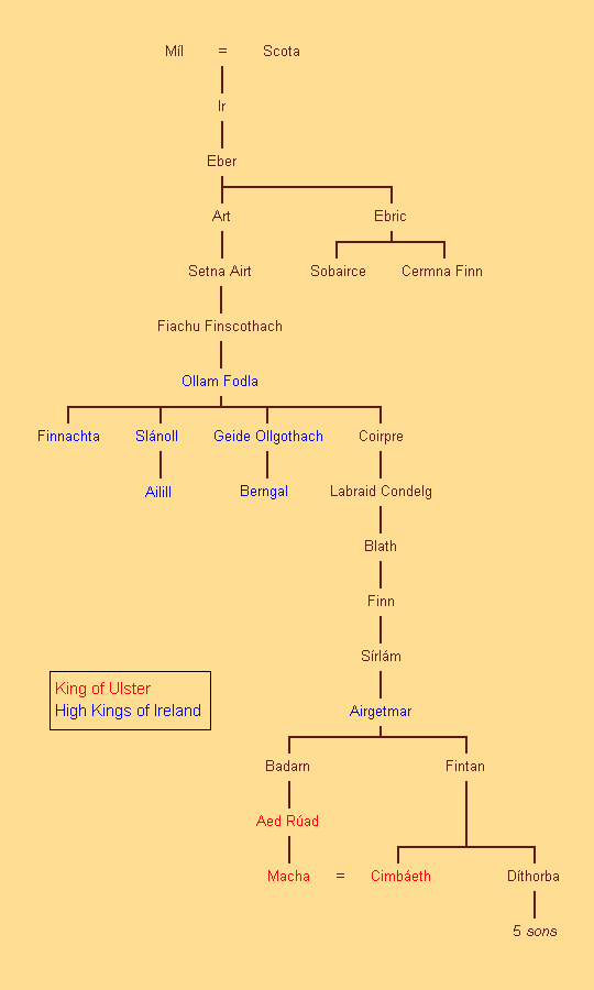 Der obige Stammbaum zeigt Macha, die Königin von Ulster, die auch als die Rote Göttin oder Rote Königin bekannt war. Macha gilt als Gründerin der Höhenfestung Emain Macha. Der Überlieferung nach verwendete Macha ihre Fibel, um die Grenzen ihrer Hauptstadt zu markieren, sodass der Name Emain Macha als “Fibel der Macha” gedeutet werden kann. Siehe Emain Macha im Ulster-Zyklus.