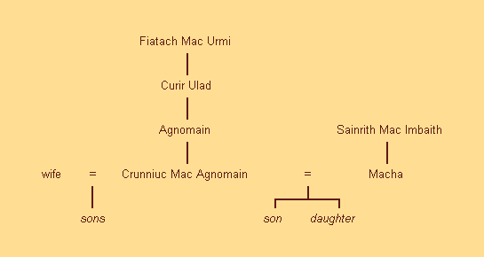 Der obige Stammbaum zeigt eine alternative Überlieferung darüber, wie die Höhenfestung Emain Macha ihren Namen von einer anderen Frau namens Macha erhielt. Diese zweite Macha war verantwortlich für den Fluch, der auf den Männern von Ulster lastete. Siehe den Fluch der Macha.
