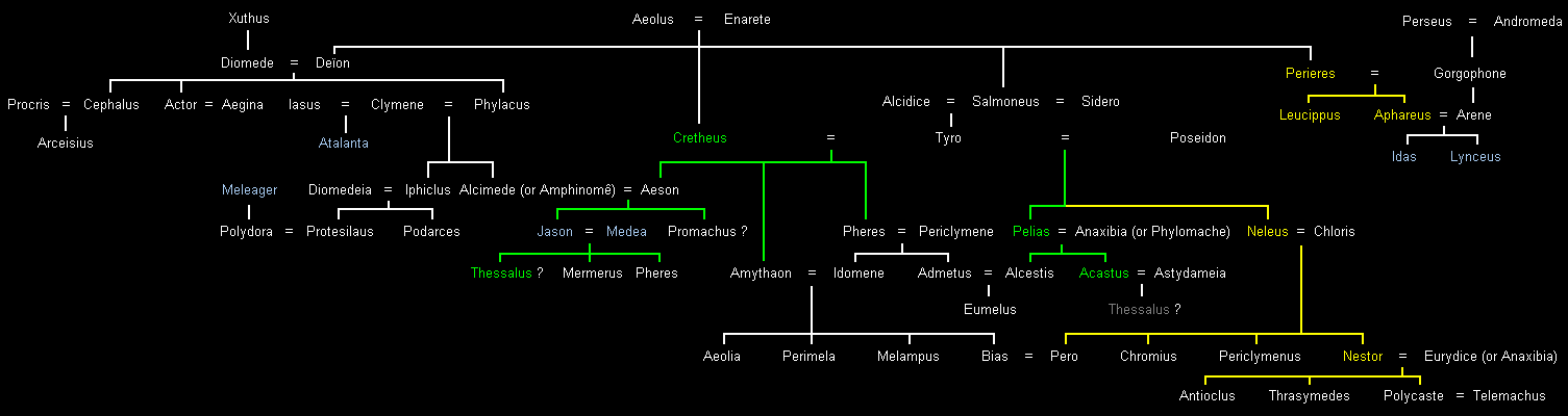 Dieser Stammbaum zeigt die vollständige Abstammung derer, die in Iolkos in Thessalien und in Pylos in Messenien herrschten; beide Linien stammten von Tyro ab, der Enkelin des Aeolus. Diese Genealogie zeigt auch die Nachkommen des Kretheus, Salmoneus und Deion, der drei Söhne des Aeolus. Aus Platzgründen ist die Linie des Deion nicht vollständig dargestellt. Beispielsweise war Kephalos, der Sohn des Deion, der Vorfahre des Odysseus.