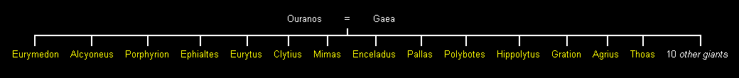 Ich konnte die Kinder von Gaea und Ouranos (Uranus), die als Gigantes oder Riesen bekannt waren, im obigen Stammbaum nicht vollständig darstellen, da es 24 Giganten gab. Daher finden Sie nachstehend einen weiteren Stammbaum, der die meisten der Gigantes enthält. Die Gigantes wurden aus dem Blut des Ouranos geboren, als sein verstümmeltes Geschlechtsteil auf die Erde (Gaea oder Ge) fiel.