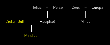 Ich habe nicht alle Ungeheuer in den ersten Stammbaum aufgenommen, hauptsächlich weil sie nicht in die Genealogie passten. Eines davon ist der Minotaurus aus Kreta. Der Minotaurus war der Nachkomme des Kretischen Stiers und der Pasiphaë, der Gattin des Königs Minos von Kreta. Der Held Theseus tötete schließlich den Minotaurus. Eine detailliertere Genealogie von Europa und Minos finden Sie im Haus von Kreta.