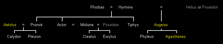 Nachstehend finden Sie einen alternativen Stammbaum für die Kinder und Enkel des Phorbas. Er ist im Wesentlichen derselbe, außer dass Augeias manchmal als Sohn des Helios oder Poseidon galt, nicht des Phorbas.