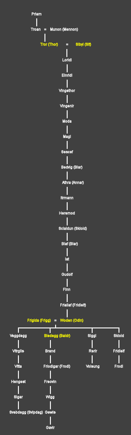 Von dort an listete Snorri neunzehn Namen von Nachkommen auf, von Thor bis zu Odin. Siehe die Genealogie unten.