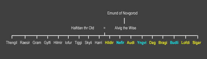 Snorri überlieferte uns eine weitere Genealogie: Gruppen von Familien, die alle mit dem König bekannt als Halfdan der Alte verbunden sind. Zu diesen Familien gehörten die Niflungen (oder Giukungen), die Budlungen, von denen Atli und Brynhild abstammten, sowie die Ynglingen.
