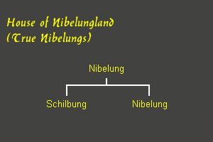 Der Name “Nibelung” gehörte ursprünglich keinem der beiden Häuser an. Es wurde ein neuer Stammbaum erstellt (unten), der die Familie des Herrn Nibelung von Nibelungenland darstellt. Herr Nibelung hatte zwei Söhne, die Könige von Nibelungenland wurden: Schilbung und Nibelung. Nach Hagens Aussage im Nibelungenlied (Kapitel 3) übernahm Siegfried das Königreich und wurde Herr der Nibelungen, nachdem er die beiden Könige besiegt und getötet hatte. Siegfried erbte den Nibelungenschatz.