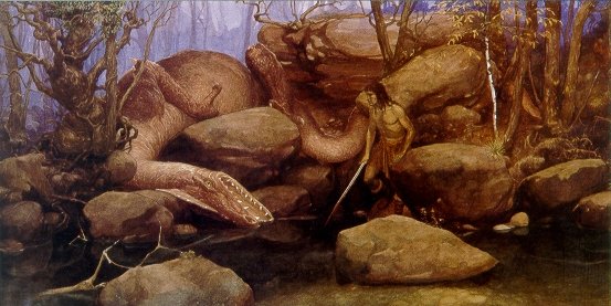 Sigurd und Regin begaben sich sodann zur Gnitaheid, der “Glitzerheide”. Sigurd grub eine Grube, um sich zu verbergen und auf Fafnir zu warten. Als Fafnir an den Fluss ging, um zu trinken, griff Sigurd an und erschlug den Drachen.