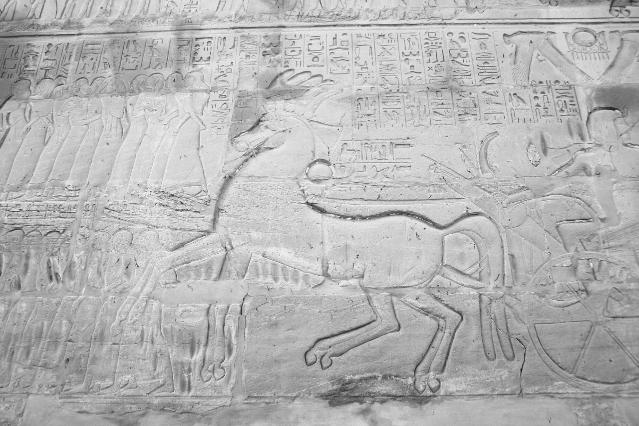 Pferde wurden im alten Ägypten selten für Arbeitszwecke eingesetzt, sondern vielmehr als Symbol königlicher Autorität und heldenhafter Taten in unruhigen Zeiten betrachtet. Die beiden Pferde von Ramses II. wurden in der Kadesch-Inschrift, einer hieroglyphischen Darstellung der Schlacht von Kadesch, als “Sieg in Theben” und “Mut ist zufrieden” bezeichnet.