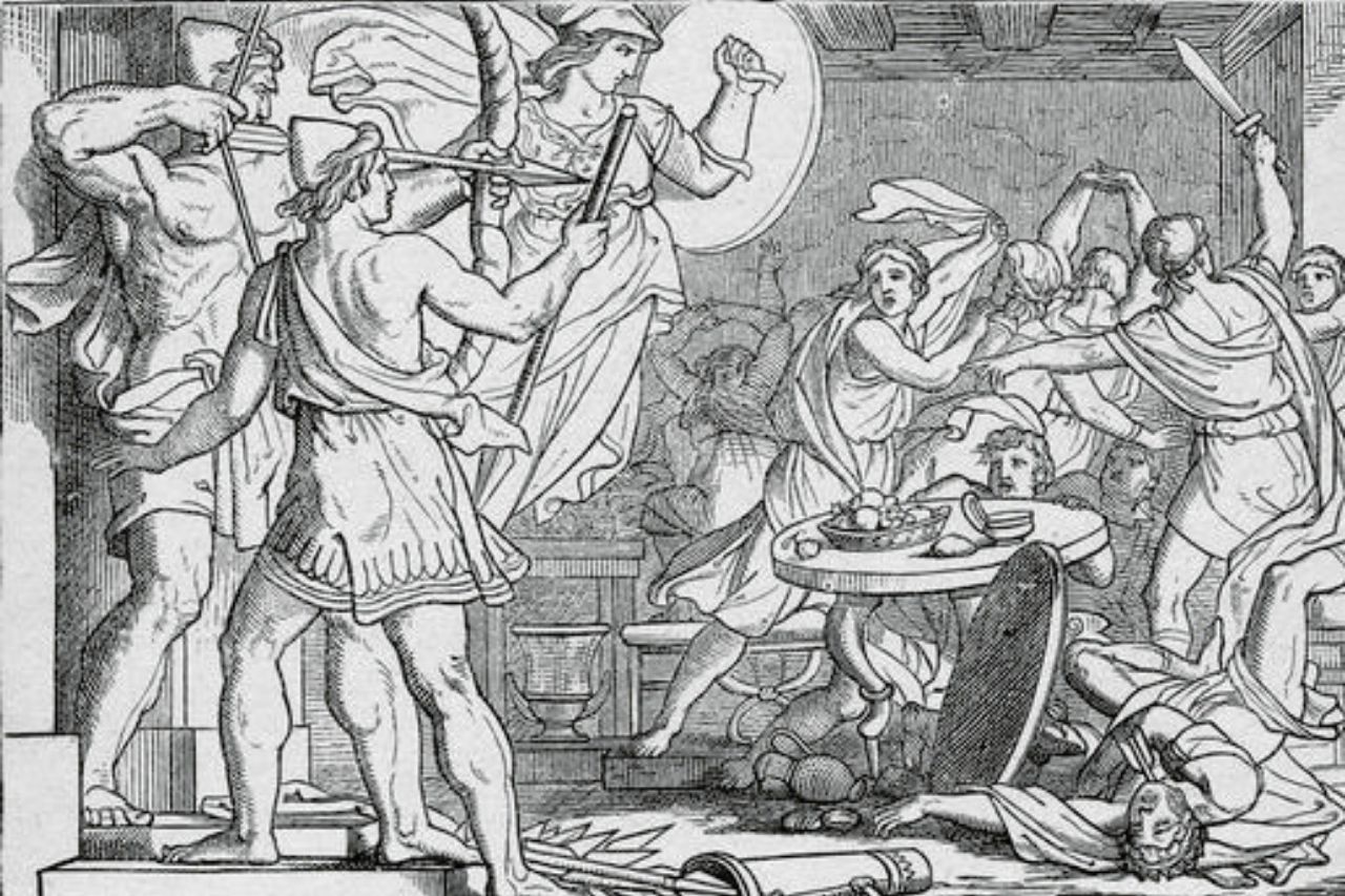 Nach dem Sieg über die Freier offenbart Odysseus seine Identität seiner Frau,Penelope, und reist sofort zu dem Ort, wo Odysseus’ Vater und Telemachos’ Großvater leben. Zusammen kämpfen die drei Generationen von Männern gegen die Familien der Freier. Laertes tötet ihren Anführer, währendAthene** eingreift, um den Frieden zu verkünden.** Die Geschichte endet, als Odysseus den Thron besteigt, obwohl verschiedene Gelehrte anderer Meinung sind. Im Allgemeinen wird das Ende der Odyssee als Odysseus’ Rückeroberung seines Throns nach einer zwanzigjährigen Reise dargestellt.