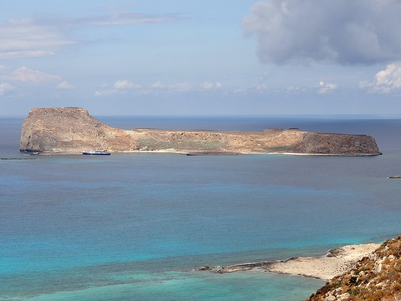 Ganz in der Nordwestecke Kretas liegt die kleine, unbewohnte Insel Gramvousa. Sie ist von Klippen umgeben, die dramatisch aus dem Meer aufragen. Die Geologie der Felswand lässt die Klippen wie von Menschen gemachte Mauern aussehen. Darüber hinaus bemerkten Severin und seine Männer, dass das Licht der untergehenden Sonne der Insel beim Näherkommen einen deutlichen roten oder bronzenen Farbton verlieh.